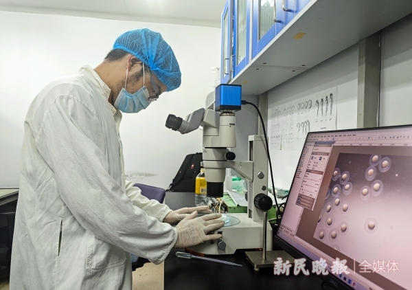 图说:斑马鱼实验室技术人员通过显微镜观察鱼卵发育情况